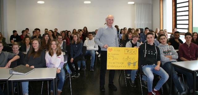 So konnte der Verein Aschaffenburger Kinderträume ein Spendenscheck über 700 Euro überreicht werden. Die verbleibenden 800 Euro gingen an die "Deutsche Knochenmark Spenderdatei" (DKMS), da im Januar 2016 eine Registrierungsaktion am Julius Echter Gymnasium realisiert wurde, bei der sich zahlreiche Schüler und Lehrer des JEG in der DKMS-Spenderdatei eintragen ließen.